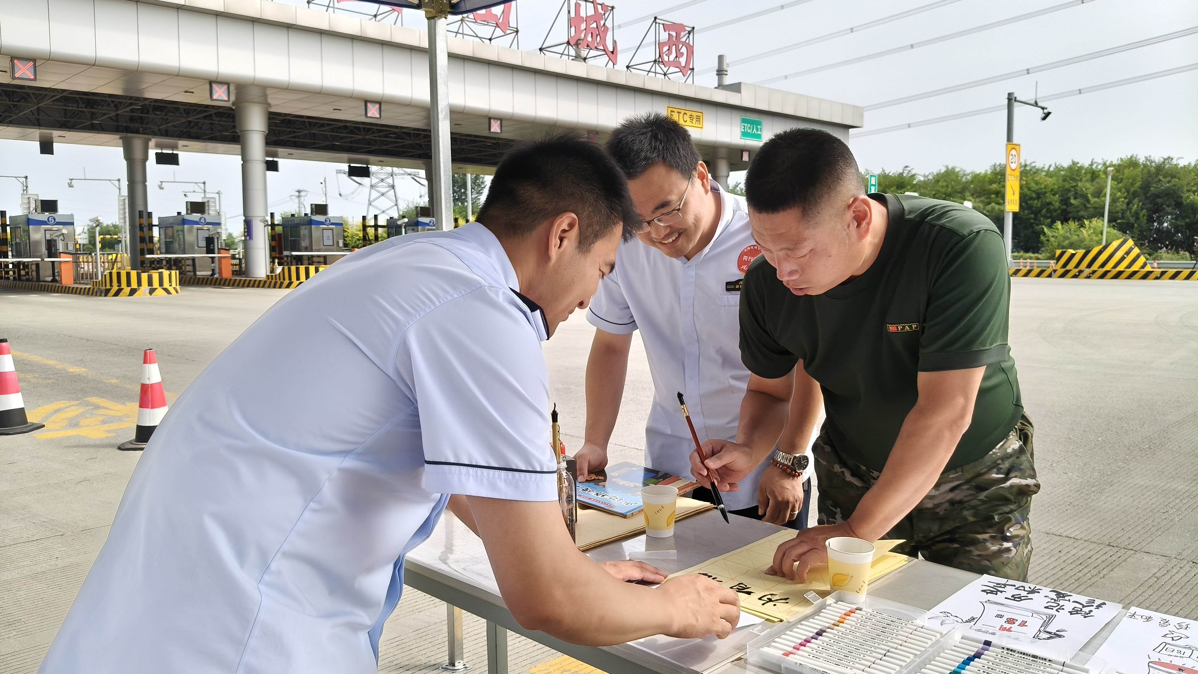 玉田城西收费站还设置了“笔墨丹青绘和平”互动区,在工作人员的引导下,不少司乘拿起毛笔,亲手书写 “铭记历史”“珍爱和平”“吾辈自强”等字句,在笔墨书香中重温历史记忆,传递爱国情怀。