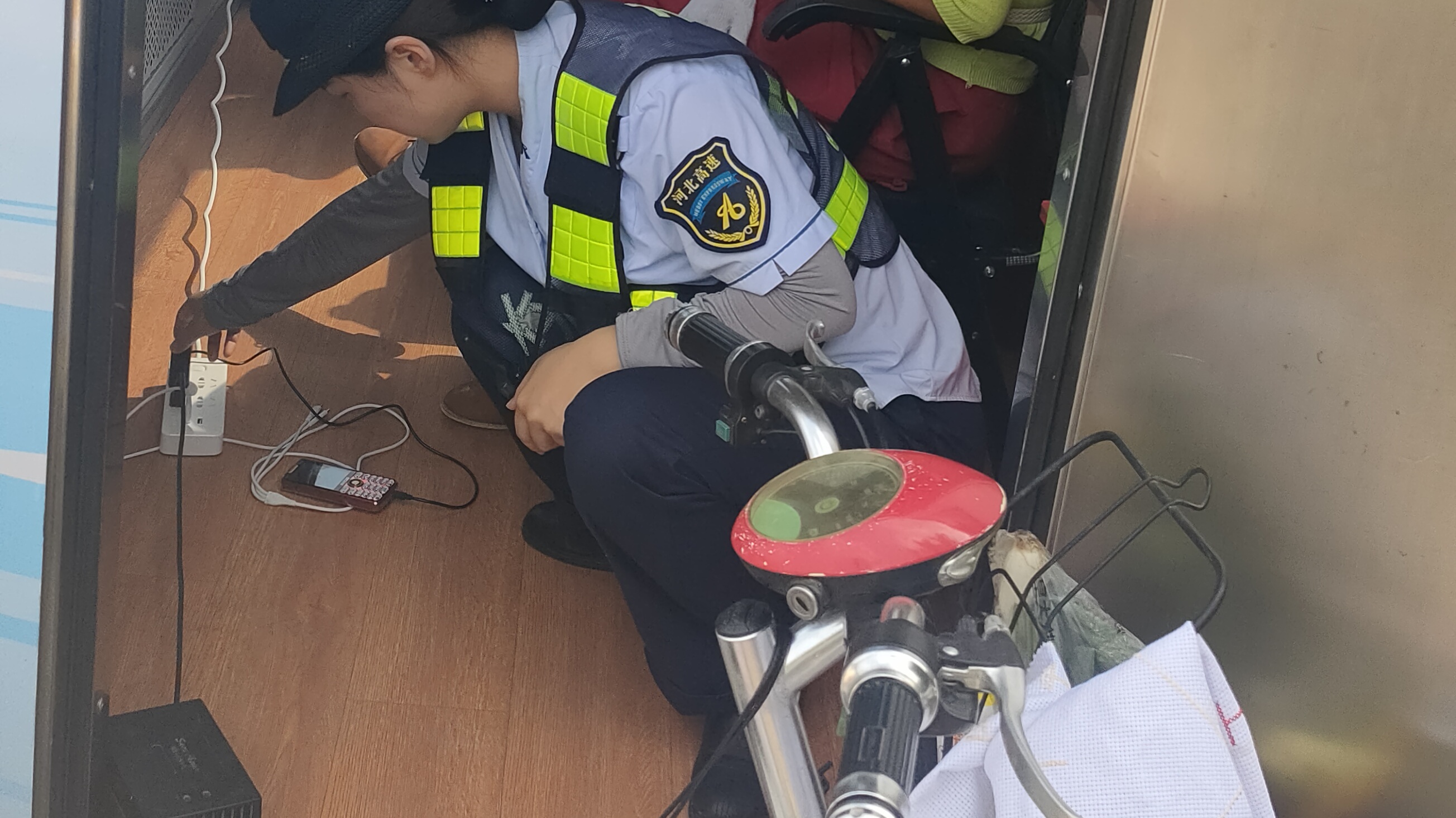 当日15时许,当班疏导员正在值岗时,发现一对母女推着电动车在路边徘徊,神情焦急。经询问得知,该女士带着女儿骑电动车返乡过节,因出发前未留意电量,行至该路段时电动车突然“罢工”,手机也耗尽电量,无法联系家人。了解情况后,外勤人员立即将母女俩引导至站内便民服务亭休息,并迅速找来电动车充电器和手机充电线,为其同时充电。