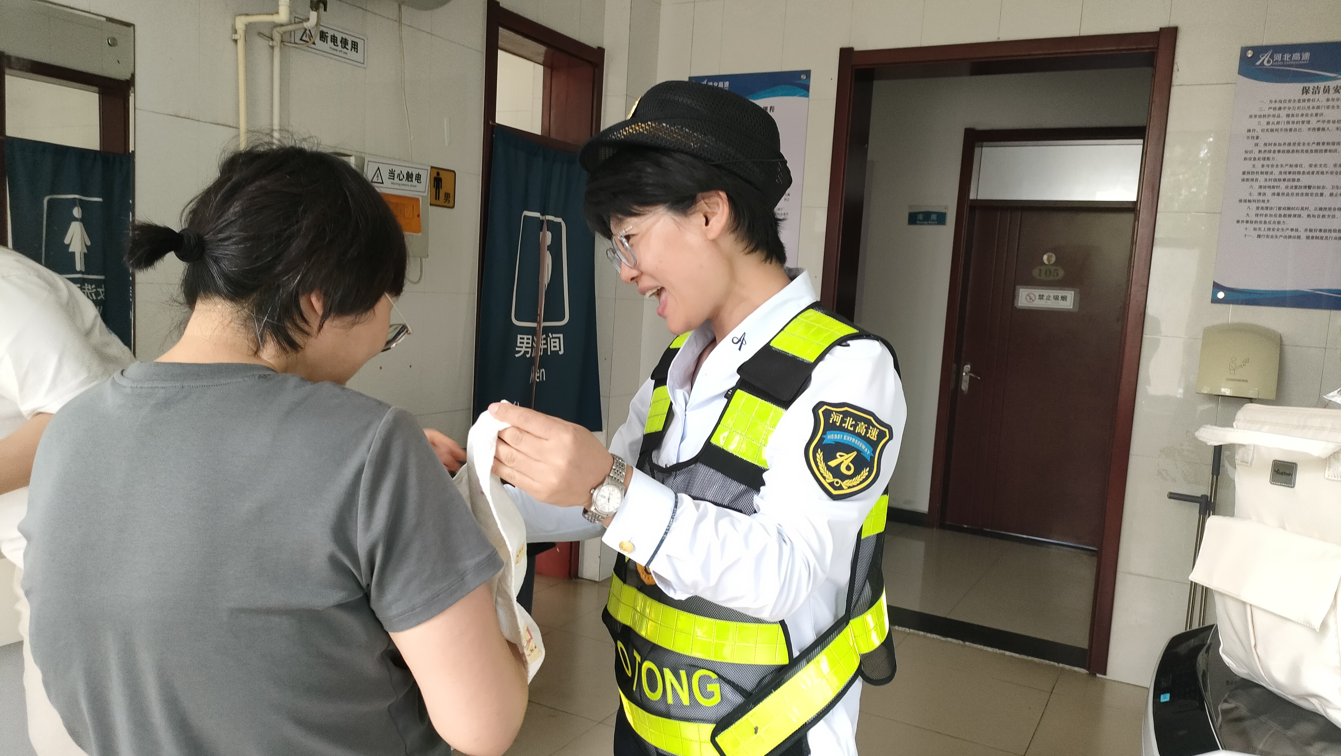 当天午后,疏导员发现一辆白色轿车停靠在广场边缘,长时间停滞不前,便立即上前主动询问情况。经了解得知,车内宝妈在途中给孩子喂奶时,发现宝宝排泄,急需找一处干净的地方为孩子清洗,所以就近下高速寻求帮助。