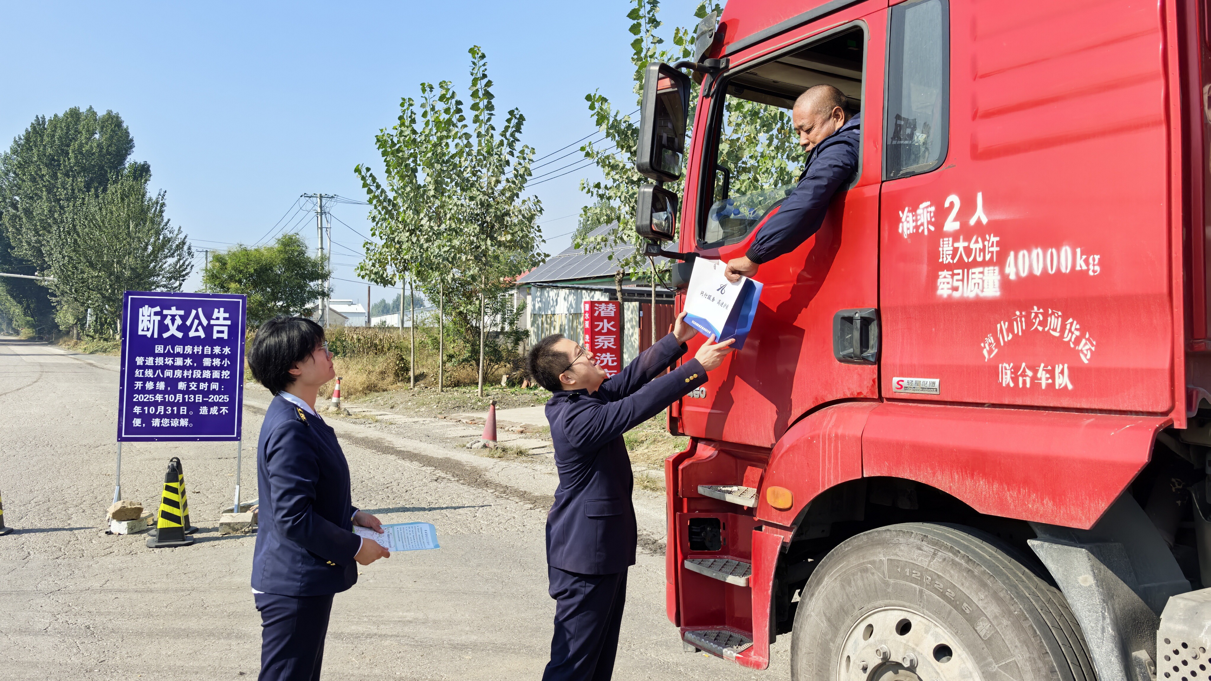 针对部分货车司机对路况不熟悉、使用导航存在延迟的情况,工作人员还主动帮忙核对导航路线,手把手标注“关键转向点”;遇到老年司机,更是放慢语速、反复叮嘱,直到对方完全清楚路线才放心离开。一张张传单、一个个礼包、一句句叮嘱,让断交带来的出行焦虑化为安心,不少司机接过传单时连声道谢:“你们提前在这指引,真是帮了大忙,不用瞎绕路了!”