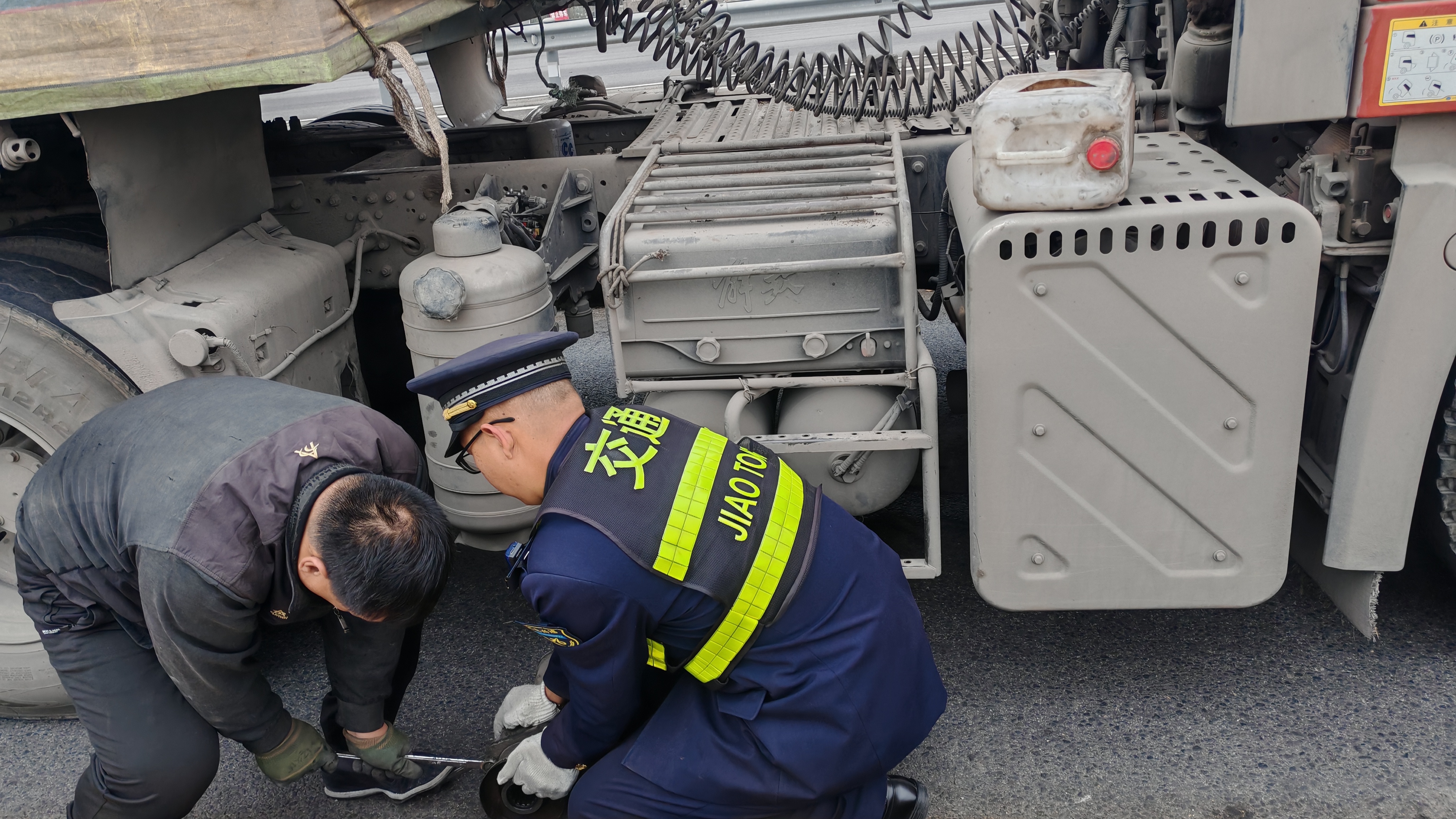 正在治超岗的收费班长见状,立即安排人员在该车道前后设置警示标识,引导后方车辆分流至其他车道,保障现场通行秩序;另一方面,安排人员找来千斤顶、梅花扳手、扭矩扳手等工具。班长与陈师傅趴在车底精准定位传动轴安装点位;其他人则负责稳固车辆、传递工具,大家手上、身上沾满油污也毫不在意。经过近50分钟的紧张操作,成功将脱落的传动轴复位并紧固。随后,工作人员协助陈师傅启动车辆进行试跑,确认车辆无异常、治超检测合格后,引导其顺利驶入高速。