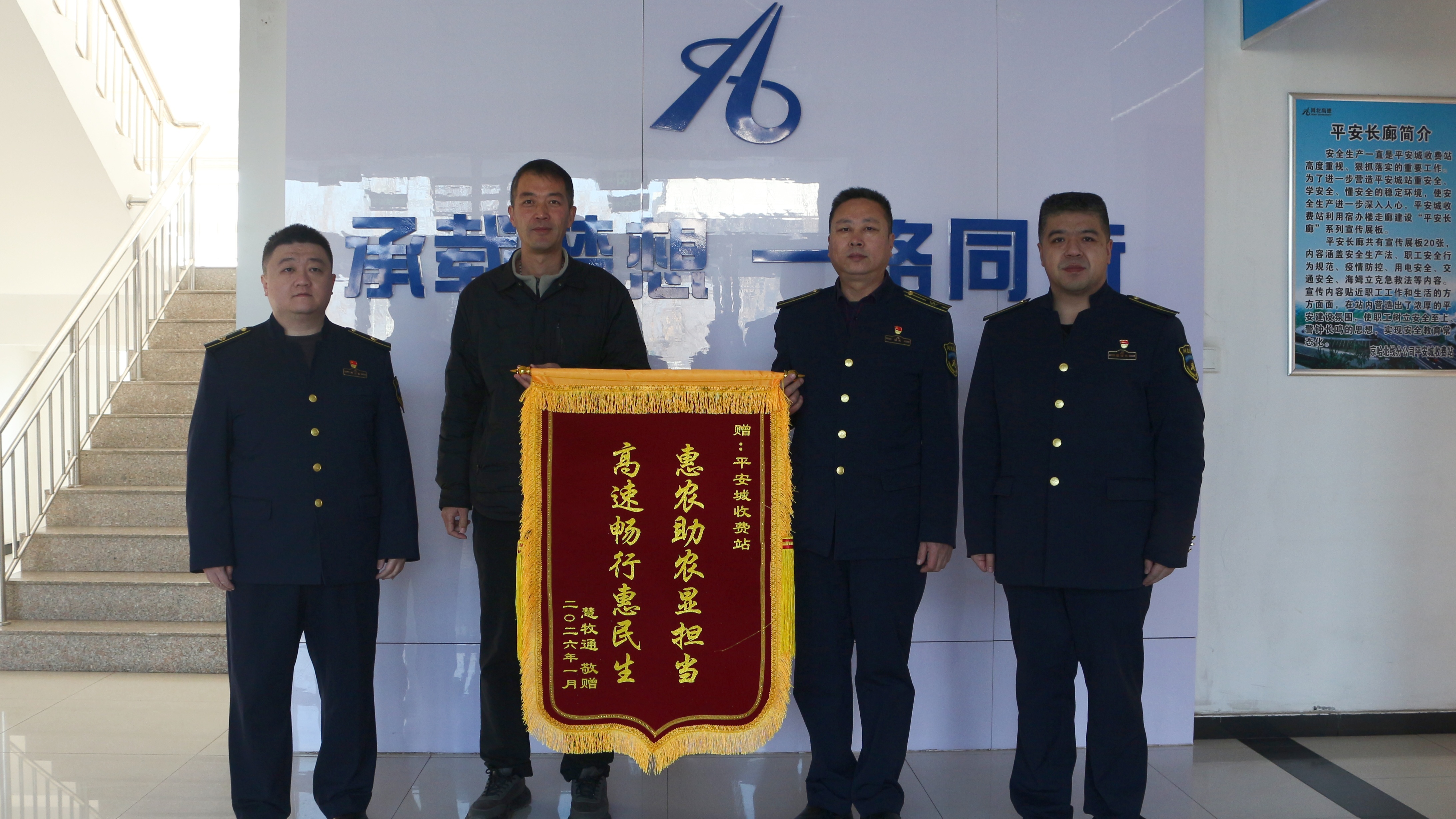 近日,平安城收费站收到慧牧通畜牧交易市场送来的一面写有“惠农助农显担当 高速畅行惠民生”的锦旗,感谢收费站用真诚热情的服务,及时为司乘排忧解难。