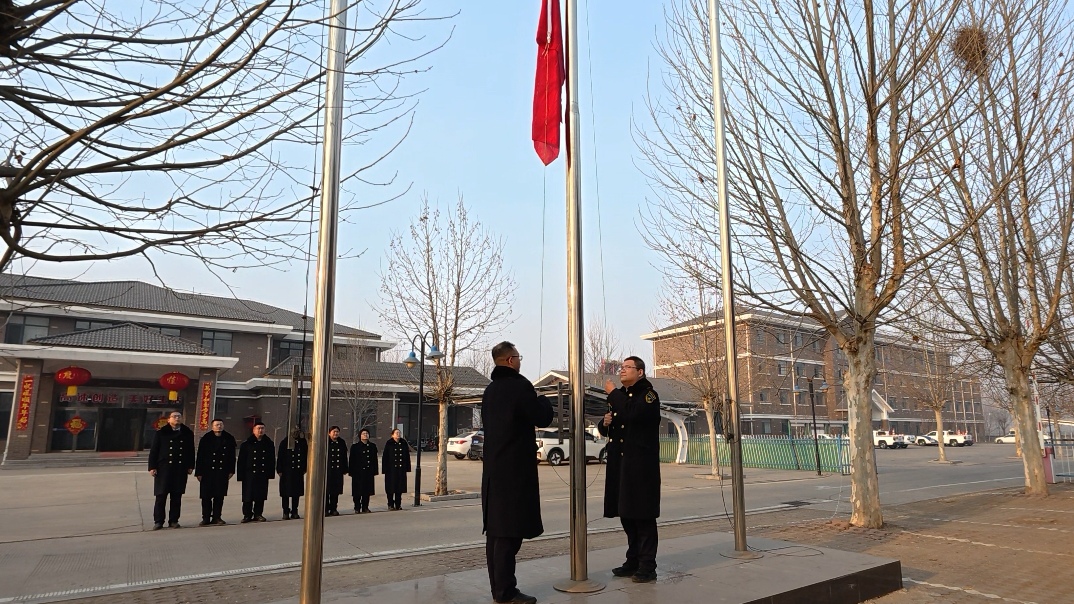 伴随着雄壮激昂的《义勇军进行曲》,鲜艳的五星红旗冉冉升起、迎风飘扬。全体人员肃立注目、高唱国歌,心中满怀对祖国的无限热爱与对新春的美好祝福,现场气氛庄重肃穆、催人奋进。