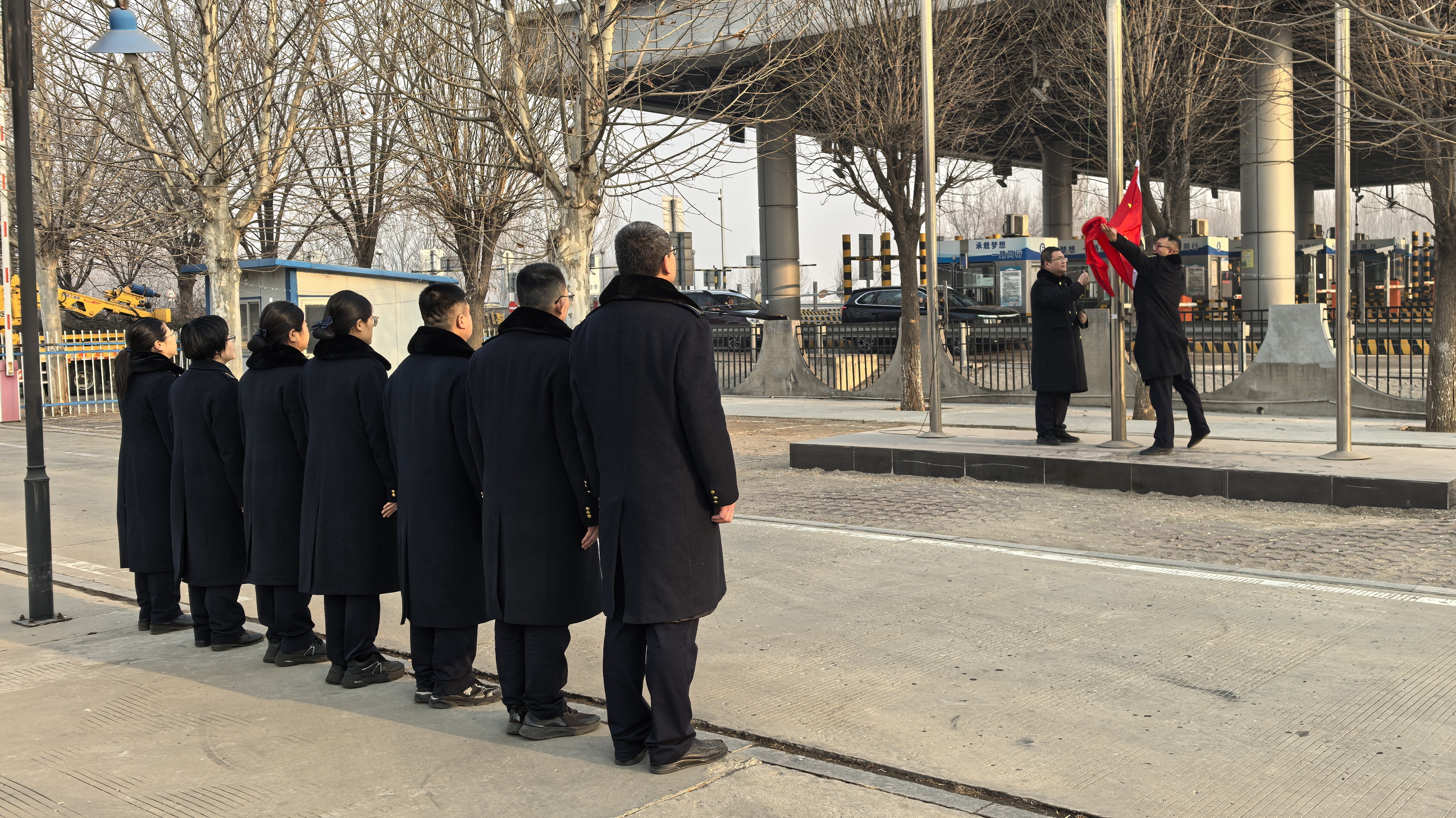 金蛇辞旧岁,骏马迎新春。为弘扬爱国主义精神,凝聚春运保畅强大合力,2月17日(农历正月初一),东新庄收费站举行庄严的升国旗仪式。全体在岗人员身着整齐制服、精神抖擞列队集结,以赤诚初心喜迎新春佳节,以昂扬姿态护航群众平安出行。