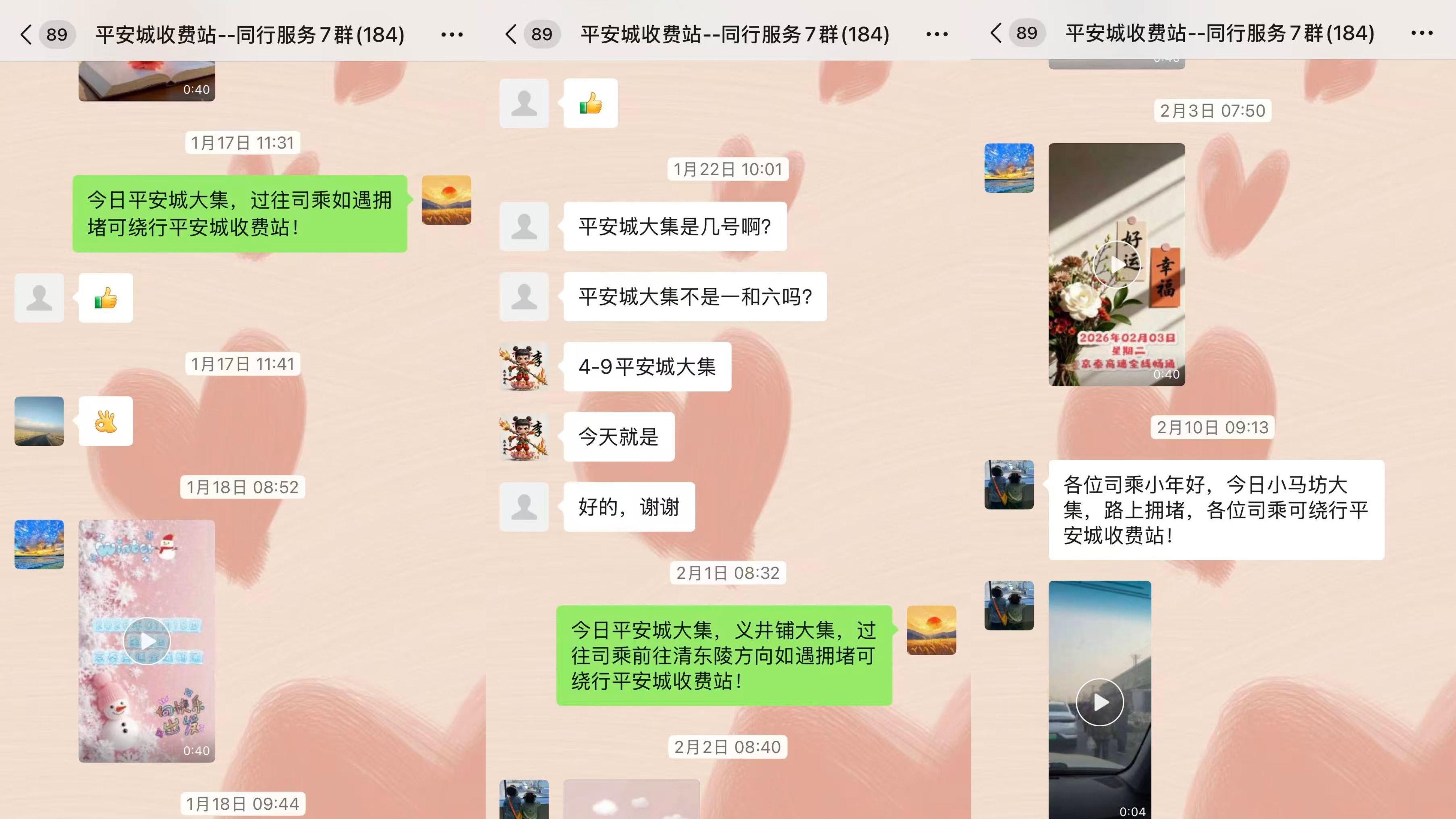 微信服务群里,职工们把出行提示送到司乘心坎里,清晰告知集市时间及绕行路线,让司乘提前掌握出行信息。面对群内司乘的路线咨询、行程疑问,职工们都第一时间回应解答,用通俗易懂的语言拆解行程要点,确保司乘行前心中有数、出行无忧。