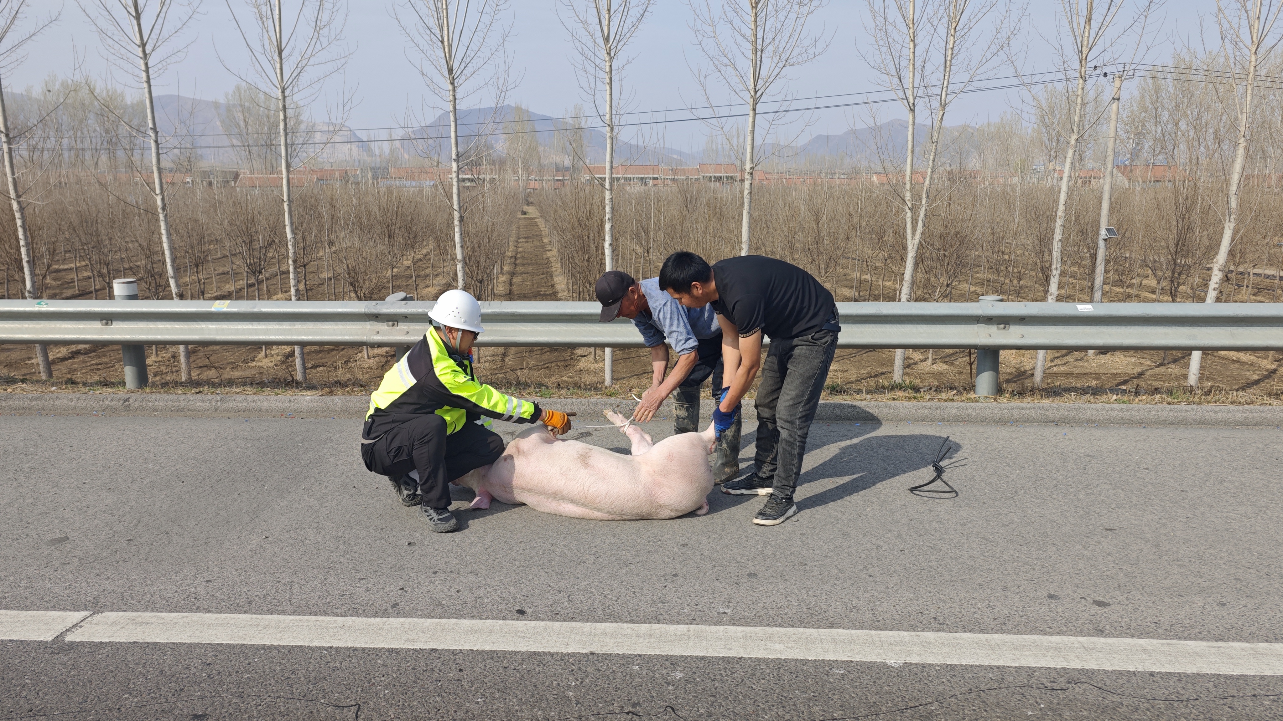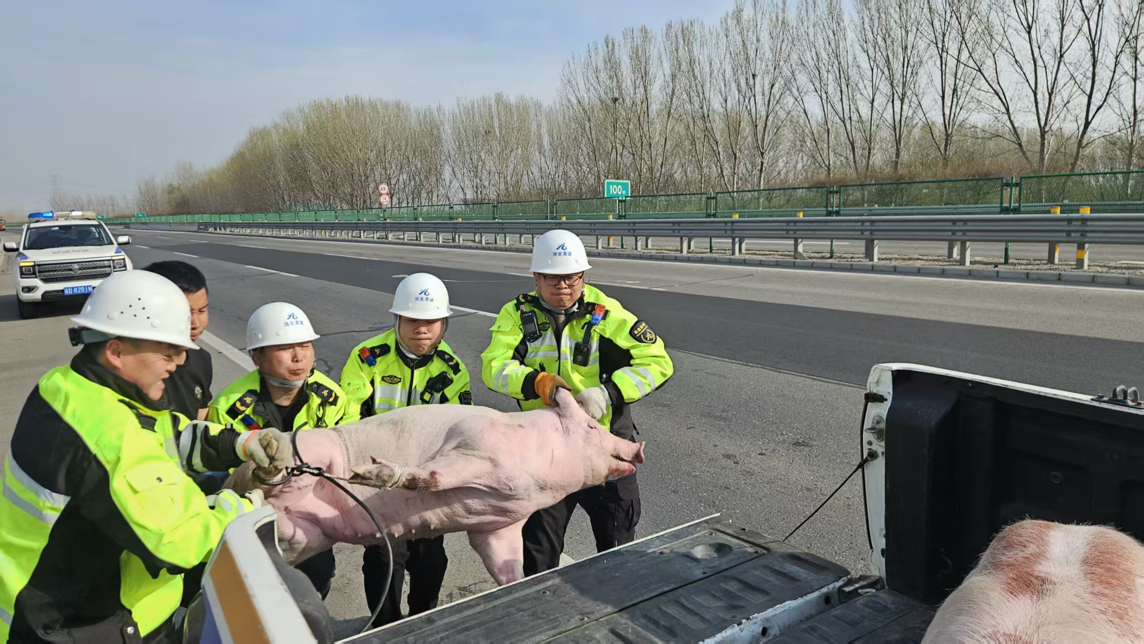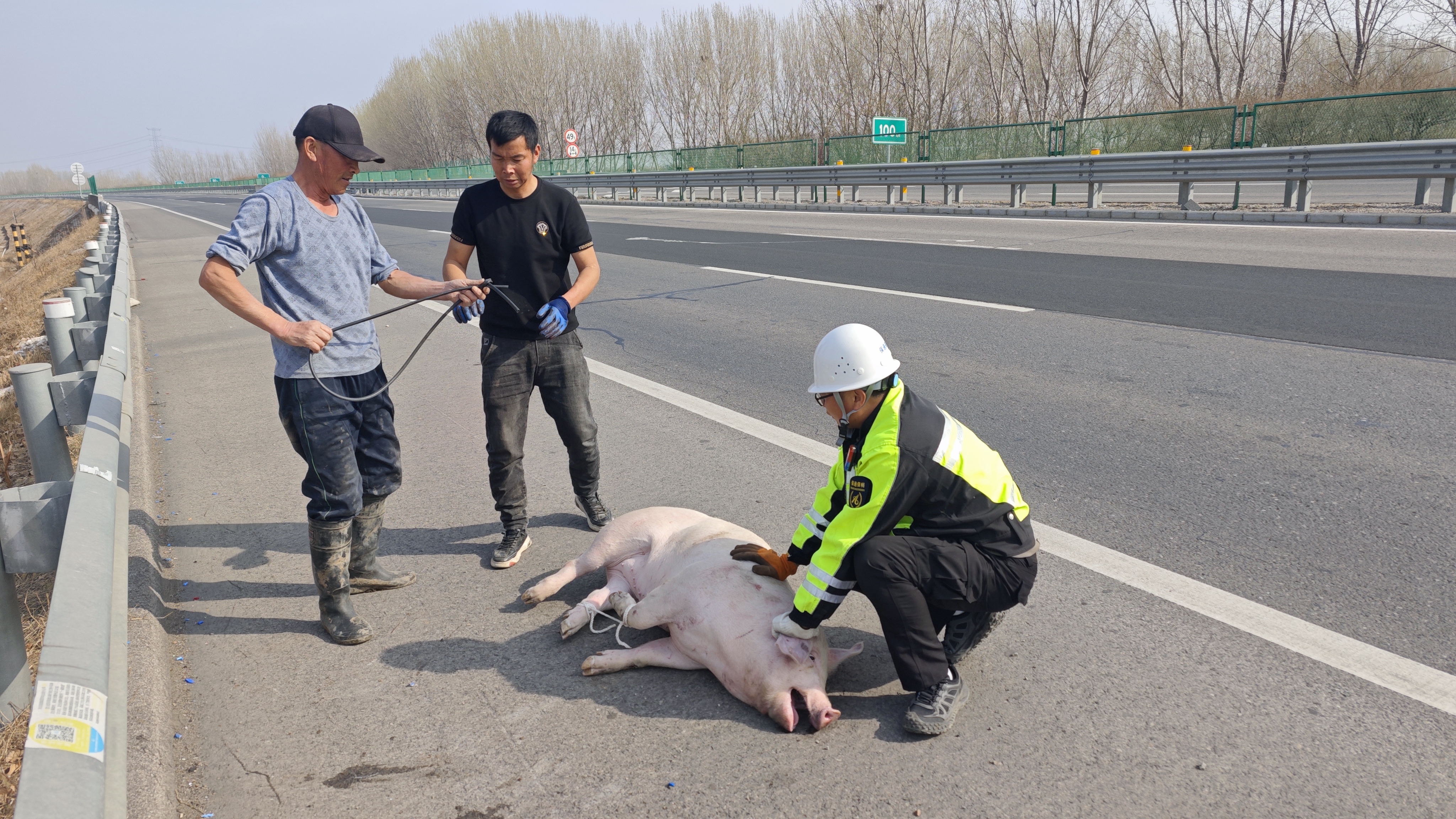 京哈北线分公司指挥调度中心保畅外业队员正在日常巡查中,发现该突发情况,队员们立即帮助司机紧急处理。面对受惊乱窜的生猪,队员们分工协作,一边设置安全警示区域,指挥过往车辆减速避让,一边化身“临时猪倌”,与货车司机合力围堵。经过近半小时的“追逐战”,3头生猪终于被成功控制,重新装车。